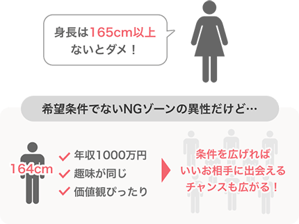 希望年齢より1歳上、身長が理想より1cm低い…といったことで、価値観が合うお相手との出会いを失ってしまうのはもったいないこと。50代、60代と今後の人生を考えたときに、本当にお相手に求めるべきことは何なのかを考え、今よりも希望条件を広げてみることで出会いの可能性はグッと高まるでしょう。