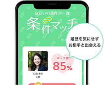また『条件マッチ』というお相手紹介の機能では、「年齢」や「お住まい」の条件以外にも、「婚姻歴」の希望条件で紹介を受けることができます。